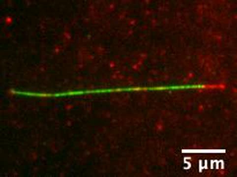 video: This video shows how microtubules (red) branch off from a template microtubule (green) to form the spindle that separates chromosomes during cell division.