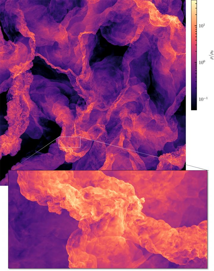 image: Turbulence shaping the interstellar medium. The image shows a slice through turbulent gas in the world's highest-resolution simulation of turbulence, published in Nature Astronomy. Turbulence produces strong density contrasts, so-called shocks (see zoom-in). The interaction of these shocks is believed to play a key role in the formation of stars.