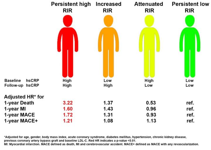Patients were stratified into four groups according to their RIR: high RIR was defined as having levels of hsCRP of more than 2mg per litre of blood. If both measurements were high, then they were considered to have persistent high RIR; patients with a high first measurement, but then a low second measurement were considered to have attenuated RIR; those with a low and then high measurement had an increased RIR; and those whose measurements were both low had a low persistent low RIR.