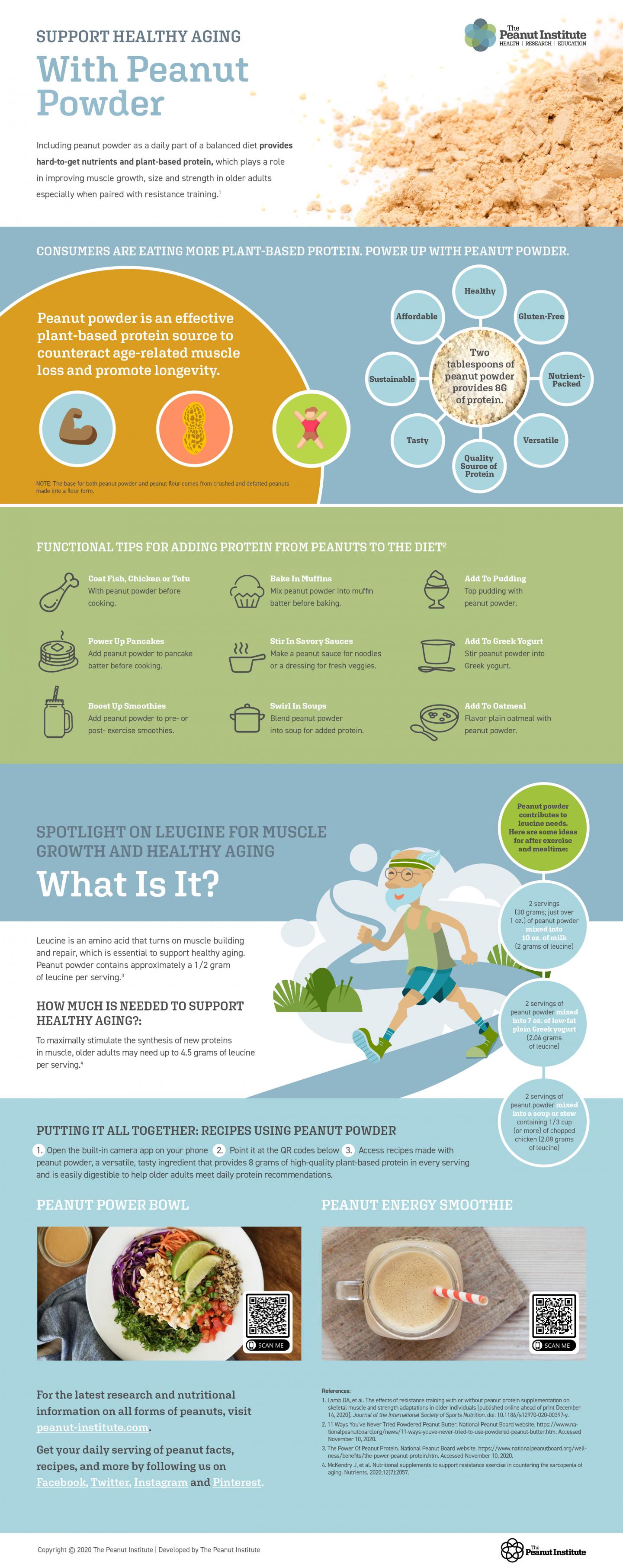 image: This infographic reviews findings from a recent study that suggests when combined with resistance training, defatted peanut powder can be an effective plant-based protein option for positively affecting select markers of muscle growth and strength in untrained older adults. Functional tips for adding peanut powder to a balanced diet are provided and recipes made with peanut powder are displayed. To download a copy of this infographic, please visit: https://peanut-institute.com/peanut-products/peanut-flour/.