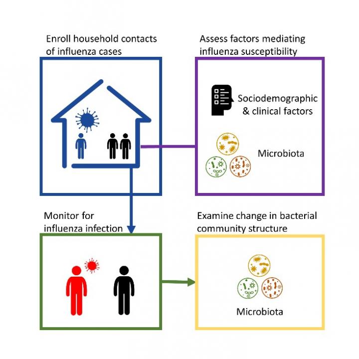 In this study, 144 Nicaraguan households with a member identified as having influenza were enrolled between 2012 and 2014 and all household adults and children monitored for up to two weeks. Study staff visited each household five times, sampling the respiratory microbiomes of all household members as well as testing for influenza infection; participants also kept symptom diaries. Using statistical modeling, the authors were able to categorize each participant's respiratory microbiome into one of five distinct community types at every visit, though approximately half of participants underwent changes in microbiome type between study visits. The authors could then compare participants' microbiome types to the likelihood of their contracting flu.