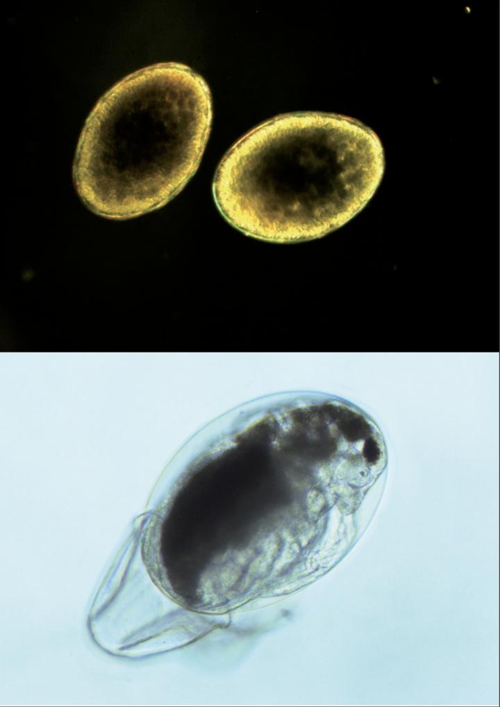 image: In this picture, a hatching Daphnia (bottom) and a pair of dormant Daphnia eggs (top-isolated from an ephippium, a kind of protective case produced by the 'mother Daphnia' in which the eggs get buried in the sediment.