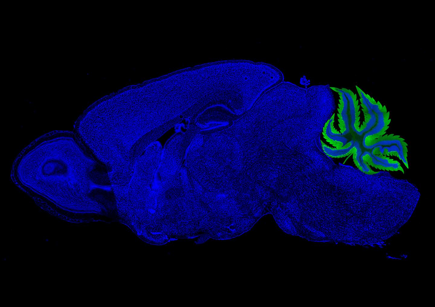 image: Fluorescent image of a mouse brain with the cerebellum highlighted in the shape of a marijuana leaf.
