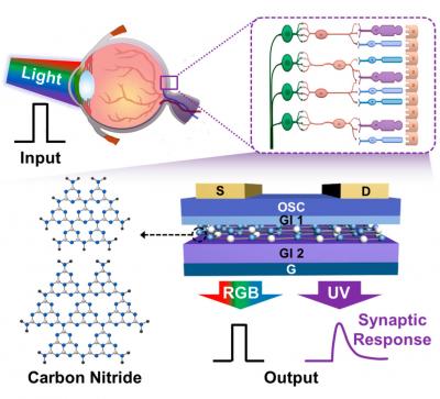 The work reported in January 27 in Advanced Materials describes retina-inspired photo-sensitive neuromorphic devices by using ultraviolet (UV)-responsive 2-dimensional carbon nitride (C3N4) nanodot layers to selectively detect and process UV exposure information. UV light (wavelength from 10 to 400 nm) is harmful to human health, but the human retina cannot detect UV. Thus, by emulating the retina, photo-sensitive neuromorphic electronics that can selectively detect and process UV stimuli would expand the human visual sense beyond visible light and be applicable to healthcare devices. The research group synthesized C3N4 nanodots dominantly absorbing UV light, and this was introduced as a UV-responsive floating-gate layer in transistor geometry. The presented devices consumed only 18.06 fJ/synaptic event, which is comparable to the energy consumption of biological synapses. Furthermore, the research team at Seoul National University demonstrated in-situ modulation of exposure to UV light by integrating the devices with UV transmittance modulators. These smart systems would be further developed to combine detection and dose-calculation to determine how and when to decrease UV transmittance for preventive health care.