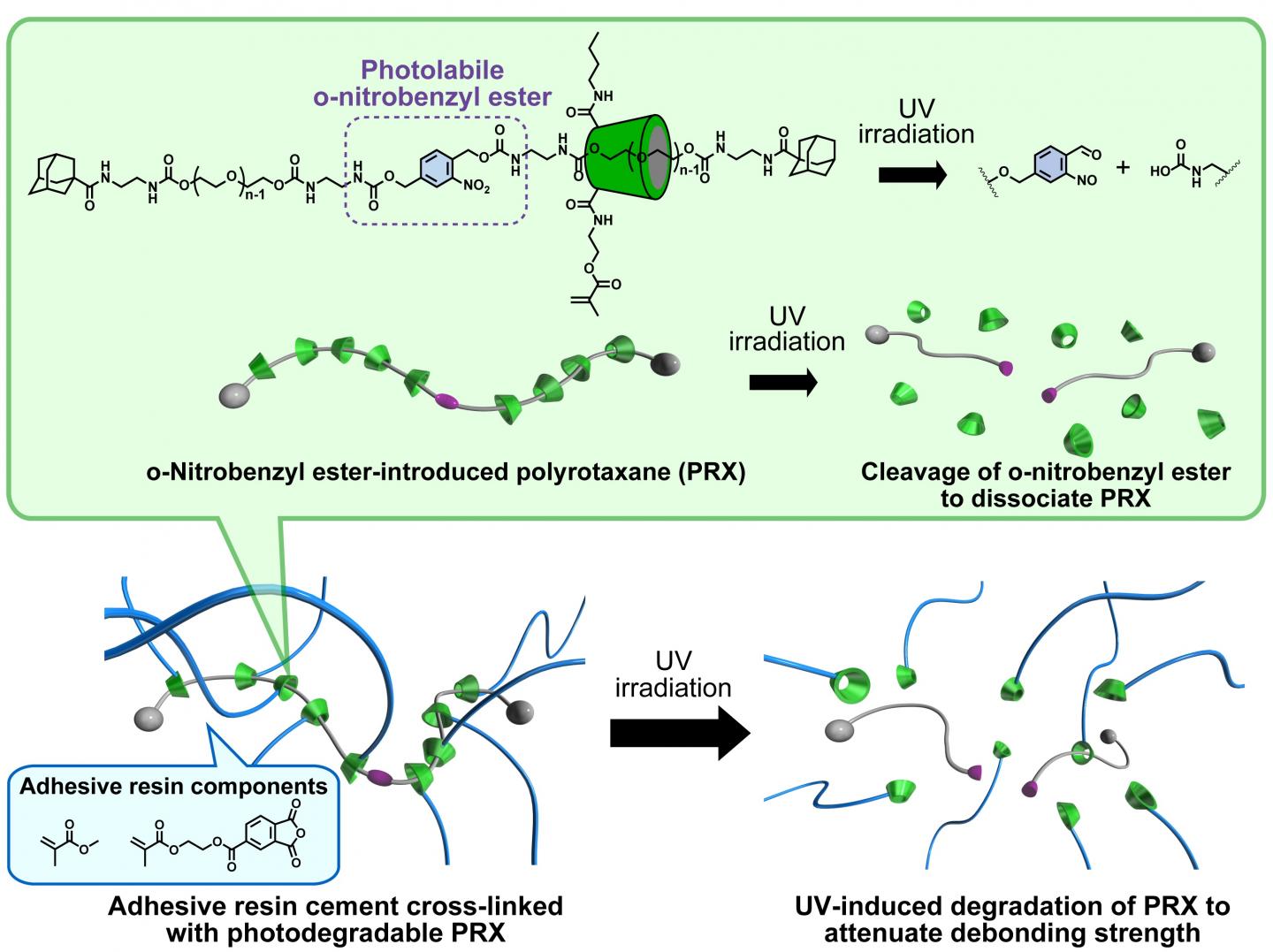 image: To facilitate the debonding of dental restorative materials adhered on tooth surfaces, UV light-embrittled dental resin cement containing photodegradable polyrotacane (PRX) cross-linkers was developed. PRX is a supramolecular interlocked polymer composed of α-cyclodextrin threaded on a linear polymer chain capped with bulky stopper molecules. The photodegradable PRXs containing photolabile o-nitrobenzyl ester was newly designed and used as a cross-linker of dental resin cements. The UV irradiation cleaves o-nitrobenzyl ester and the PRXs are dissociated, leading to decreasing the adhesive force of the dental resin cements. The plastic block was adhered on to the surface of bovine dentin using adhesive resin cement cross-linked with photodegradable PRXs, and the adhesive strength between plastic and dentin was clinically acceptable value. By contrast, the adhesive force was decreased by approximately 60% through the irradiation of UV light for 2 min, due to the photodegradation of PRX cross-linkers. This result suggests that the adhesive resin cement containing photodegradable PRX cross-linkers is a promising candidate for facilitating the debonding of dental materials from tooth surfaces via UV light irradiation.