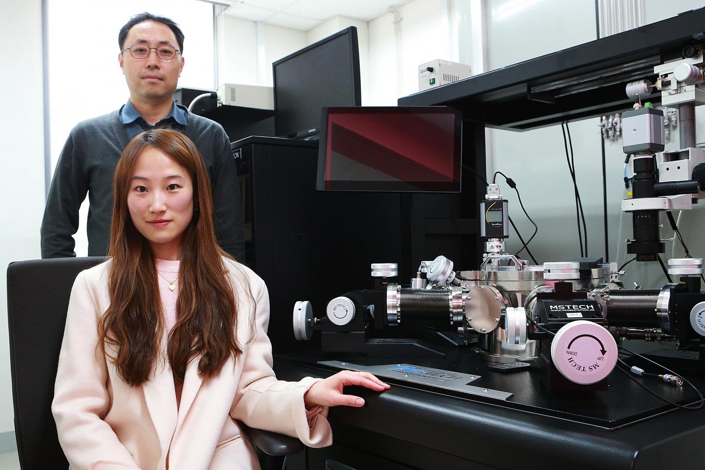 image: Professor Jae Eun Jang (back) and Ms. Su Jin Heo (front) next to their experimental setup, with which they observed how cracks formed and propagated in thin flexible conductors with various types of micro-hole arrays.