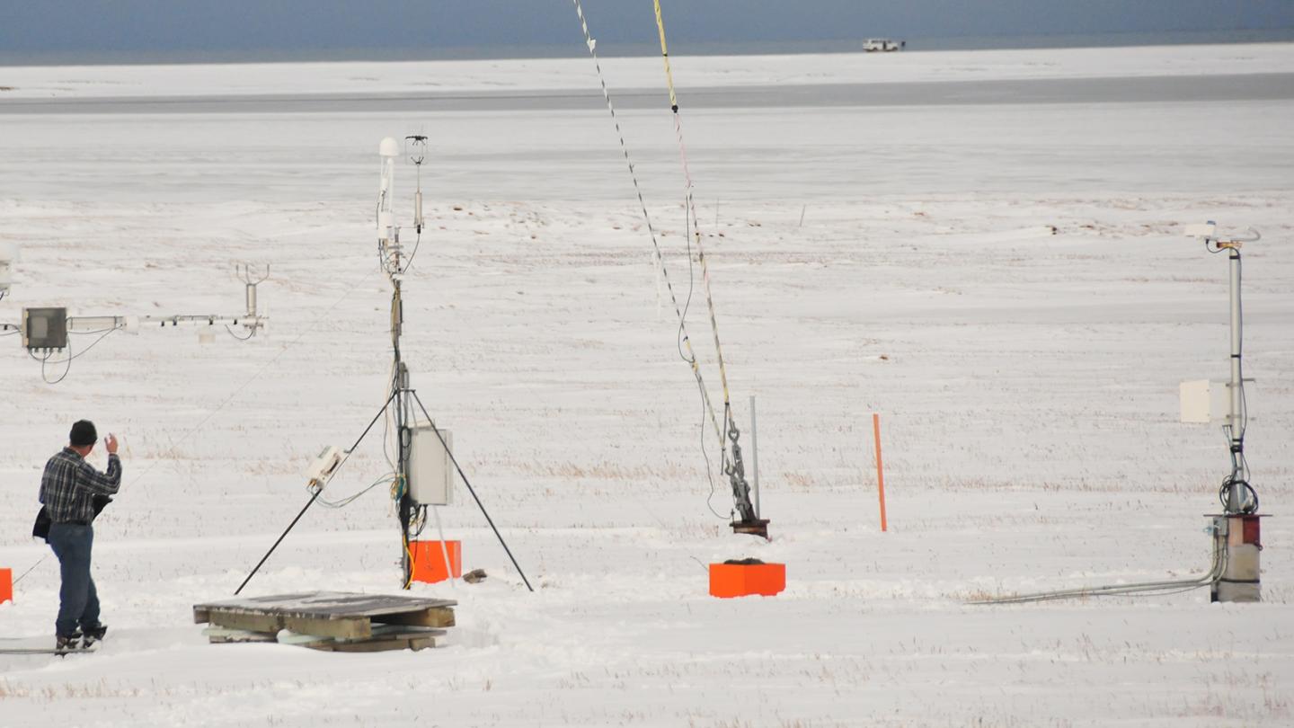 image: David Cook, a recently retired Argonne meteorologist, performs maintenance on an eddy correlation flux measurement tower, operated by the DOE-funded Atmospheric Radiation Measurement (ARM) program, in Utqia?vik, Alaska. The tower exemplifies one of several types of instrumentation used to generate the data in this study.