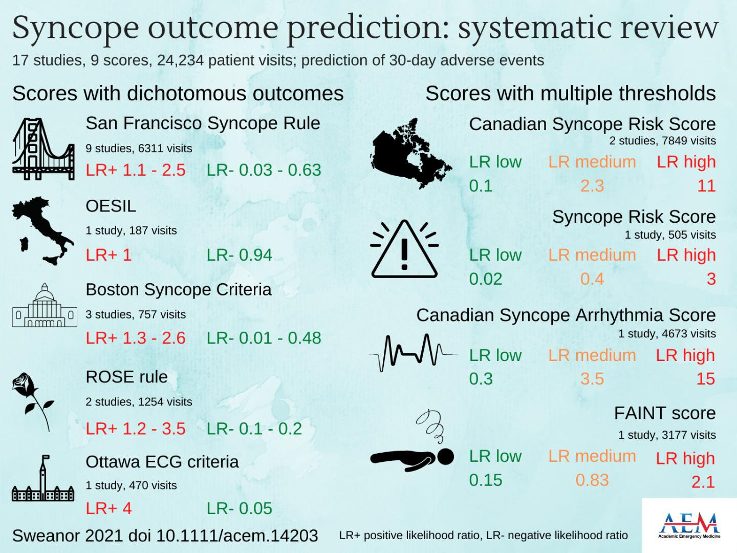 Overall, this systematic review provides an updated qualitative overview of the accuracy of nine risk stratification scores among adult patients following a syncopal event. Many scores in the study are not validated or not sufficiently accurate for clinical use. Other risk scores were not validated on an independent sample, had low positive likelihood ratios for identifying patients at high risk, or had high negative likelihood ratios for identifying patients at low risk.