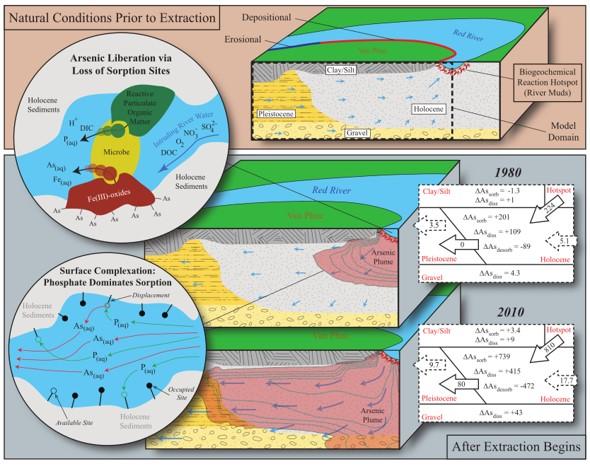 At the study site, changes in groundwater flow occurred over the past 50 years since the city of Hanoi markedly increased the extraction of groundwater to satisfy its steadily increasing water demand; this showed to be the main trigger for arsenic pollution in the aquifer. The computer modelling allowed the researchers to pinpoint the source of arsenic down to the river muds that are regularly deposited at the more slow-flowing zones of the Red River. The organic matter contained in those muds fuelled a biogeochemical reaction that led to the release of arsenic and its km-long transport into the aquifer underlying the Van Phuc village, a process that continues to this day. Employing their developed computer model in predictive mode the researchers were able to illustrate the interplay of four key factors on the evolution and longevity of arsenic release at surface water/groundwater interfaces, (i) the abundance of reactive organic matter; (ii) the abundance of iron oxides; (iii) the magnitude of groundwater flow; and (iv) river mud deposition rate.