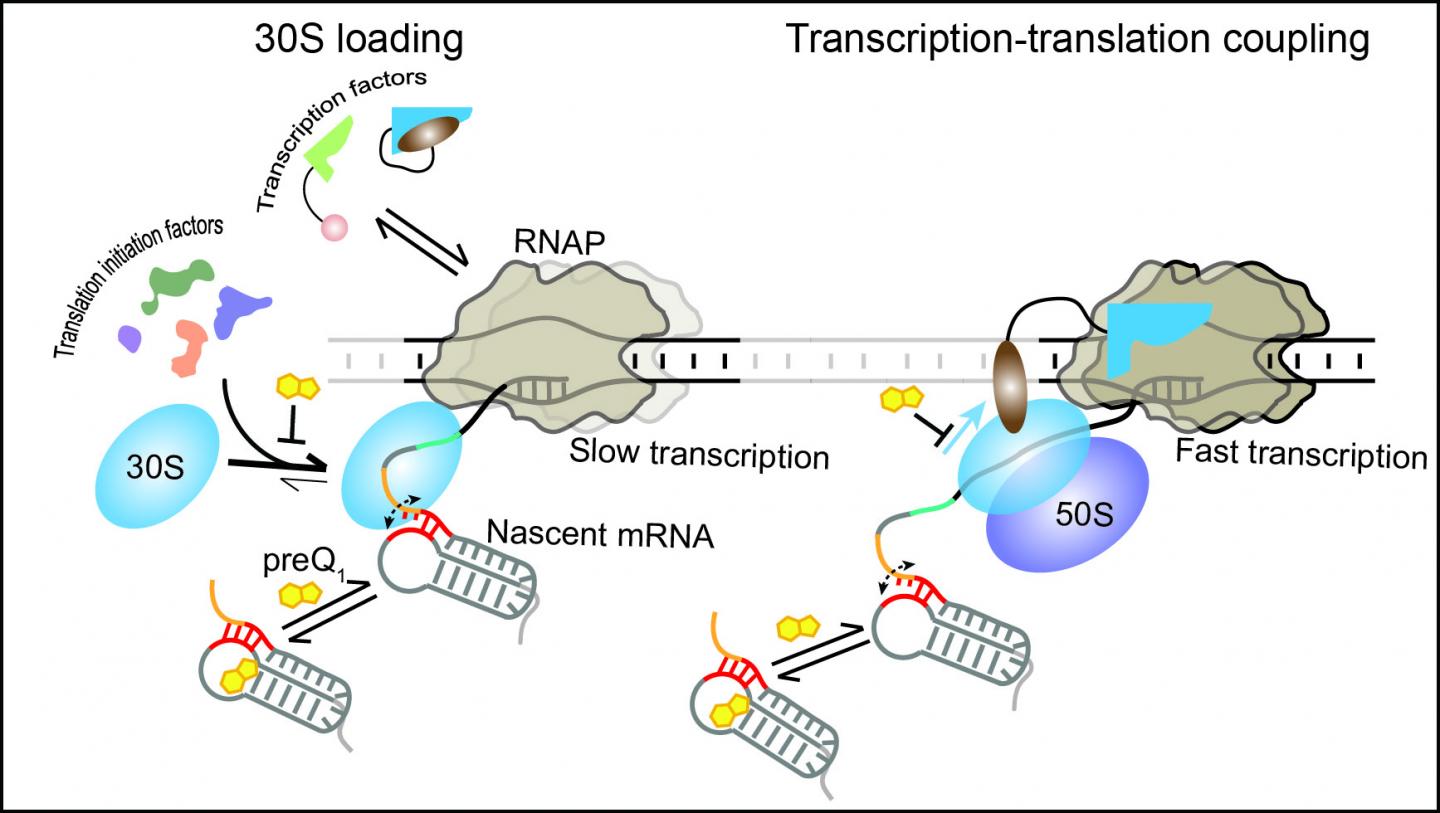 image: The 30S subunit of the ribosome can dynamically bind to the nascent mRNA as soon as its binding site emerges from the RNAP. Transcription factors and translation initiation factors assist in the initial binding and retention of the 30S subunit on the mRNA, resulting in the stabilization of an early initiation complex. During translation, the ribosome can follow the leading RNAP, establishing transcription-translation coupling and maintaining optimal transcription speed. In the presence of the ligand preQ1, transcription-translation coupling is disrupted, surprisingly leading to slow transcription.