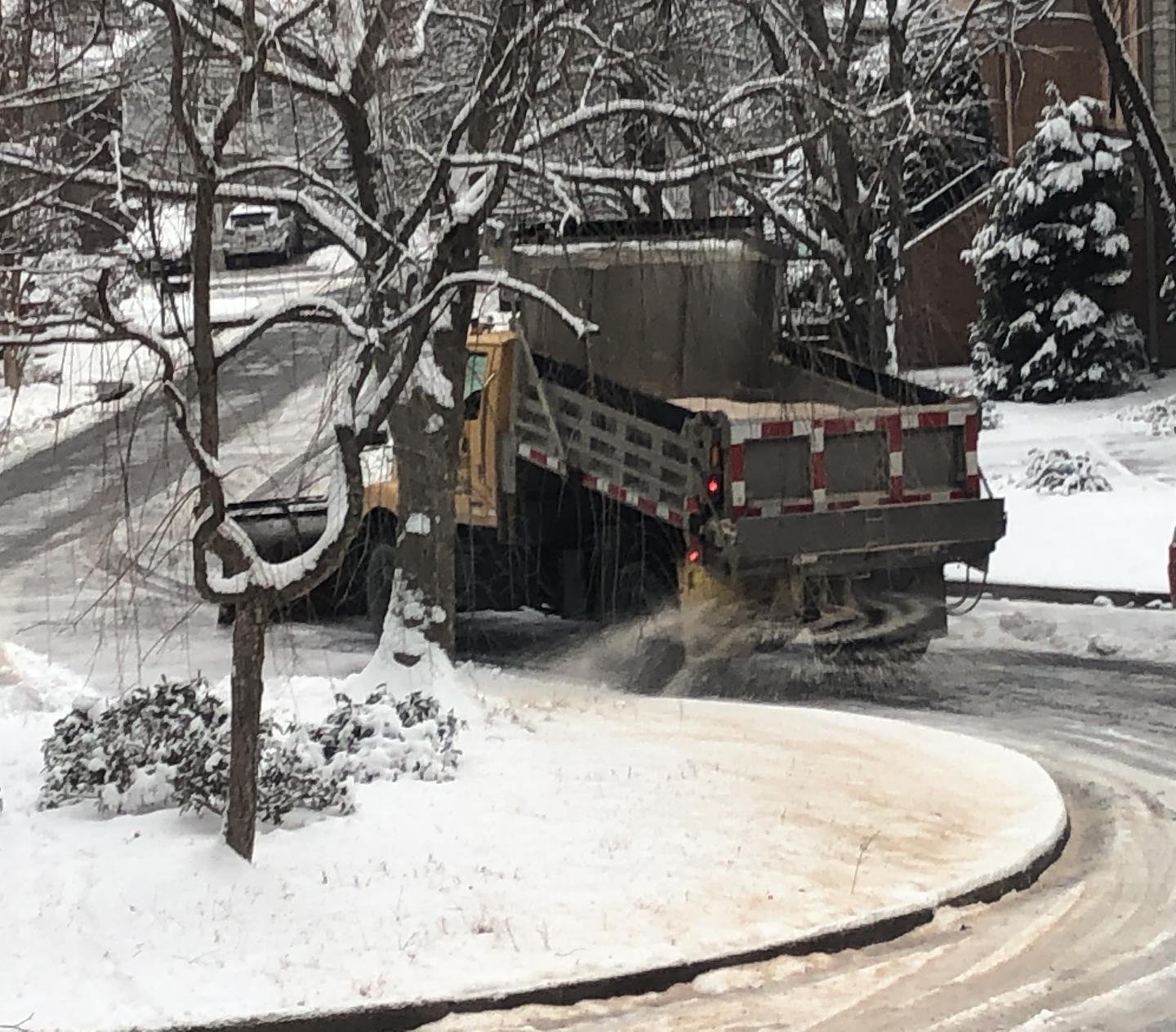 image: A truck applies salt to a road during winter storm.