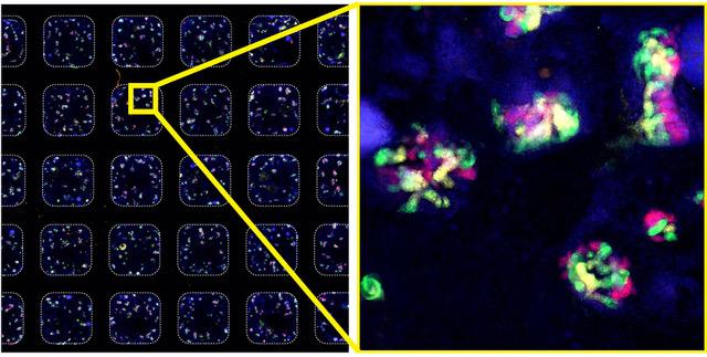 image: This is a bird's eye view of a microwell plate containing kidney organoids, generated by liquid handling robots from human stem cells. Yellow boxed region is shown at higher magnification. Red, green, and yellow colors mark distinct segments of the kidney.