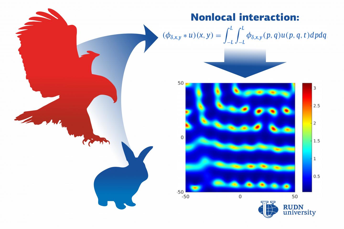 The team tested their concept using computer modeling and found out that even if a system initially has equal numbers of carnivores and herbivores, after some time their quantities start to grow differently at different points due to nonlocal interactions. As a result, the total quantity of the system becomes dominated either by predators or prey, and different spatial patterns are formed. Another feature of a nonlocal system is bistability, i.e. possible coexistence of two patterns. This is an important attribute of nonlocality. It is the initial conditions that determine which pattern eventually succeeds.