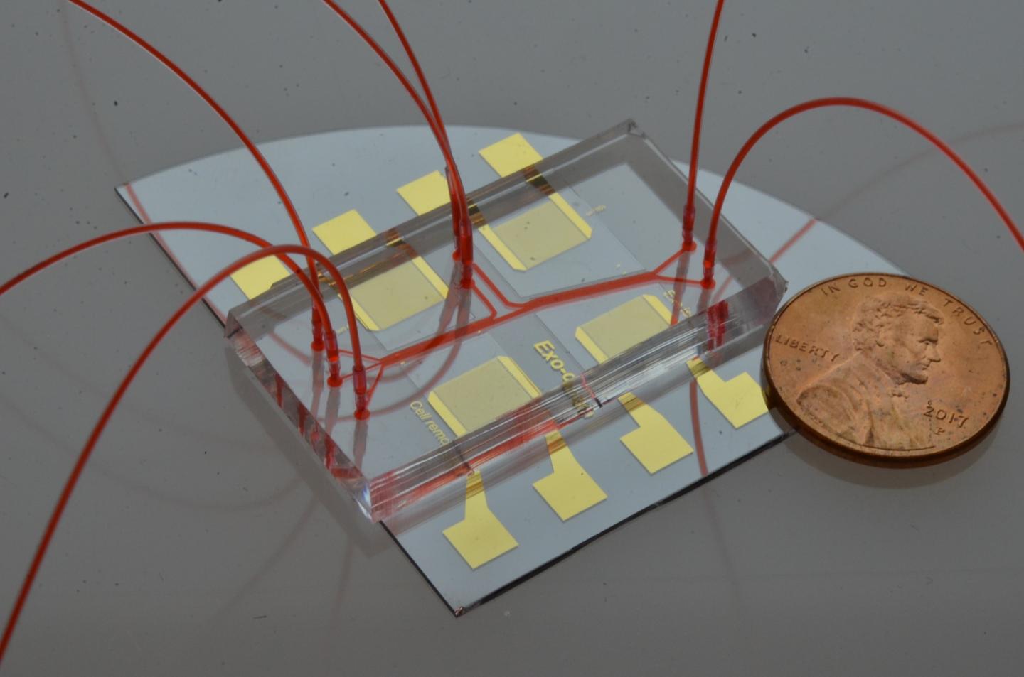 image: Acoustofluidic exosome isolation chip for salivary exosome isolation. The microfluidic channel is shown by red dye solution and the coin demonstrates the size of the chip. Two pairs of gold interdigital transducers are deposited along the channel, which separates particles according to size.