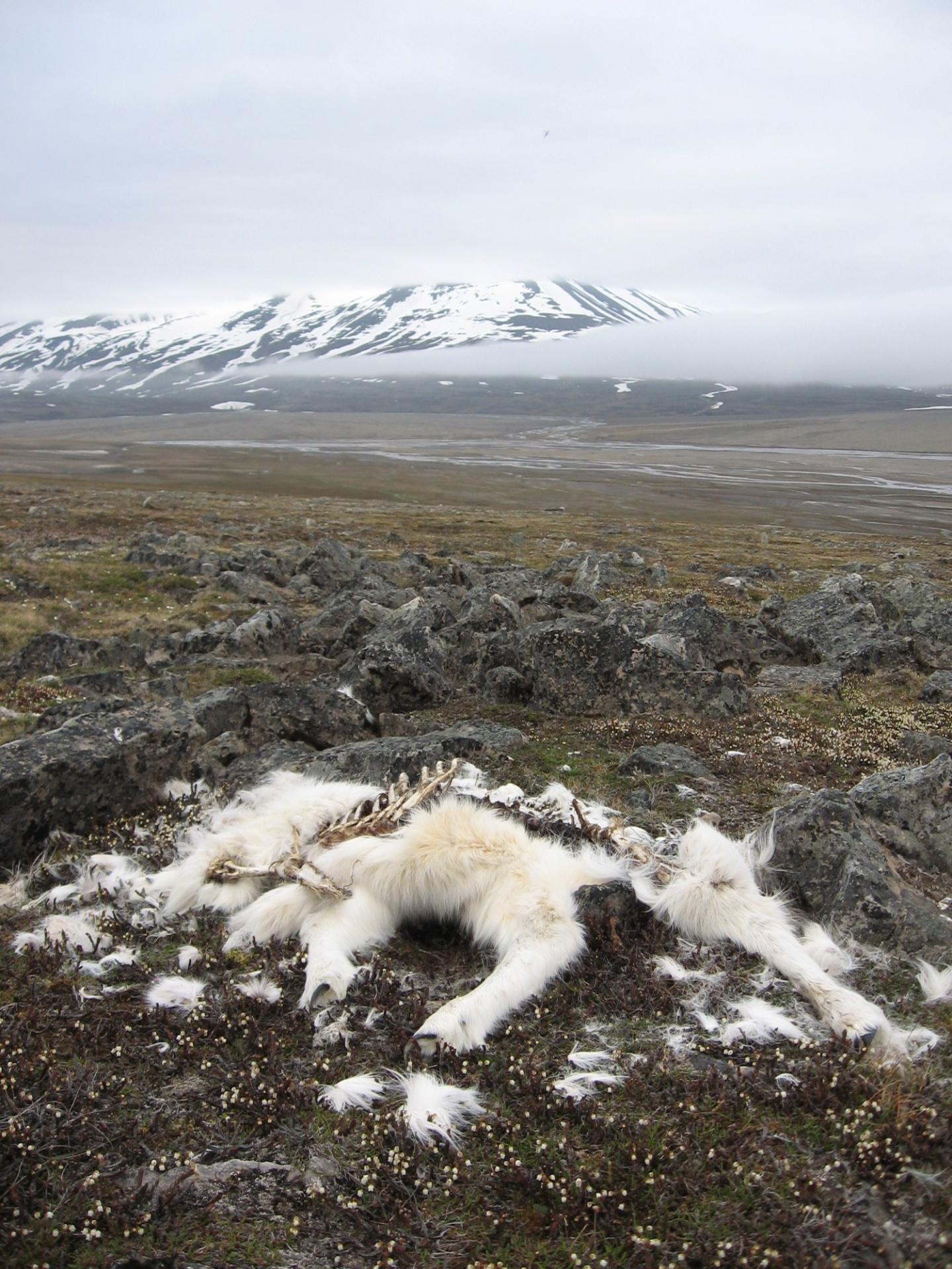image: A carcass of a reindeer that died due to an icy winter on Svalbard.