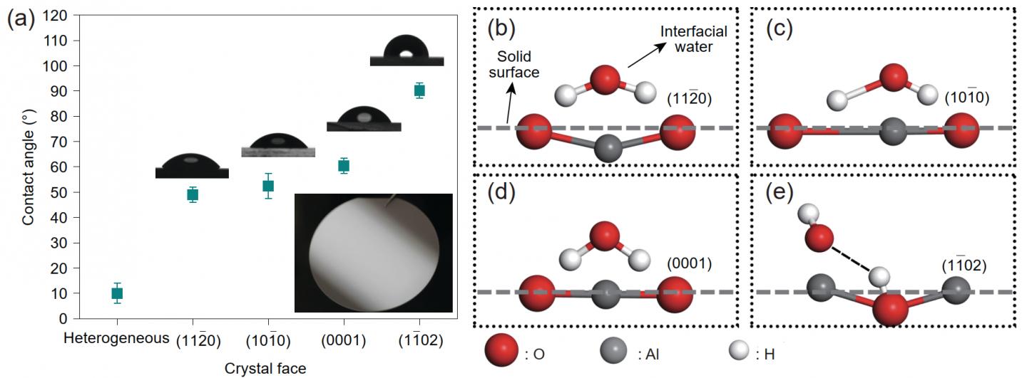 image: Macroscopic wettability differences of different α-Al2O3 crystal faces and schematic diagrams to illustrate the mechanism at the molecular level. (a) Polycrystalline alumina is highly hydrophilic, while α-Al2O3 crystal faces with (11-20), (10-10) and (0001) orientations are hydrophilic, but (1-102) crystal face is hydrophobic (inset shows the optical image of a mirror flat single crystal α-Al2O3 sample). Schematic diagrams show the composite structure of adsorbed interfacial water molecules and the exposed solid atoms. The orientations of water molecules will result in two typical status offering two lone pair electrons (b-d) or one hydrogen atom (e) at the topmost position, which, in turn, result in hydrophilic and hydrophobic, respectively.