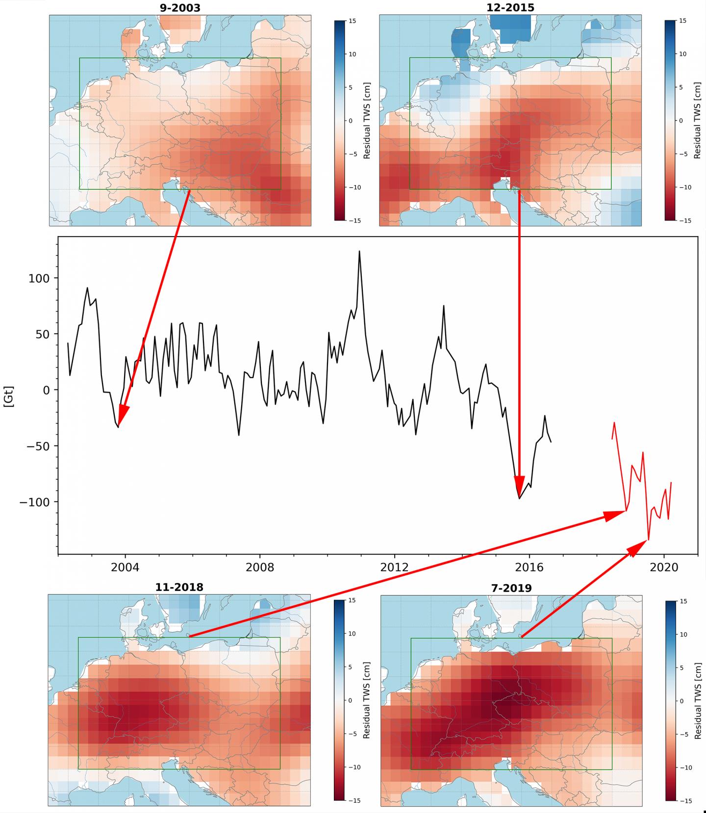 image: The four Central European droughts of the years 2003, 2015, 2018, and 2019: Shown are the water mass anomalies, i.e. the long term mean annual signal has been removed. The time series plot in the middle displays the total water mass anomaly over Central Europe in gigatons, whereas the four maps show the spatial distribution of the anomalie (in equivalent water height) in the driest month of each drought year. (Eva Börgens, GFZ; Based on GRACE/GRACE-FO GFZ RL06 as available from gravis.gfz-potsdam.de)