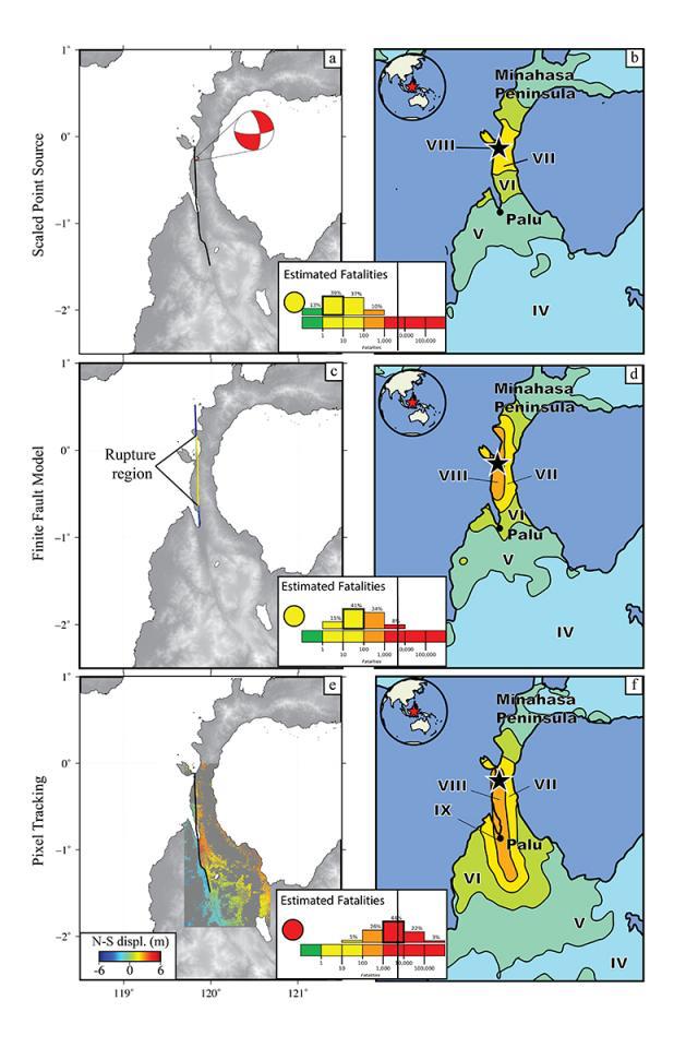 image: The image shows the evolution of earthquake response products that detail the expected number of fatalities for the 2018 Indonesia earthquake. The first two rows show the estimates based on seismology approaches, and the third row shows the estimates based on satellite observations. The histograms show predicted numbers of fatalities with the vertical bar indicating the actual number of fatalities. The satellite observations capture this number accurately, while the seismological observations systematically under predicted the number.