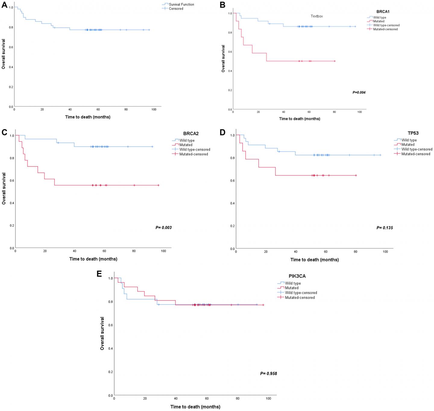 image: Survival plots for major gene mutations. Major gene mutations have showed effects on survival (A) overall survival, (B) BRCA1 survival, (C) BRCA2 survival, (D) TP53 survival and (E) PIK3CA survival.