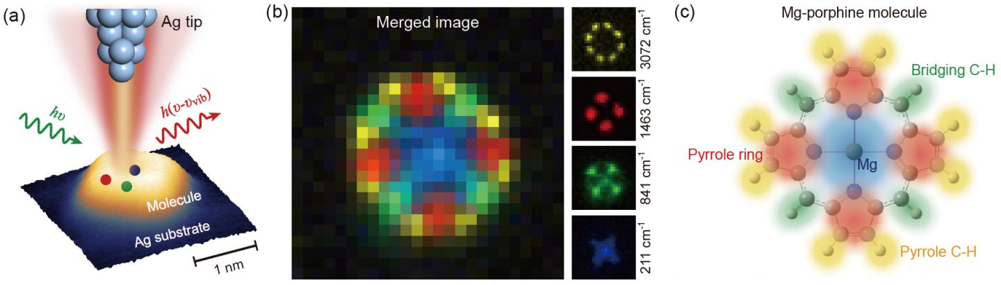 image: (a) Schematic of scanning Raman picoscopy (SRP). When a laser beam is focused into the nanocavity between the atomistically sharp tip and substrate, a very strong and highly localized plasmonic field will be generated, dramatically enhancing the Raman scattering signals from the local chemical groups in a single molecule right underneath the tip. (b) Merged SRP image by overlaying four typical Raman imaging patterns shown on the right insets for four different vibrational modes. (c) Artistic view of the Mg-porphine molecule showing how four kinds of chemical groups (colored "Legos") are assembled into a complete molecular structure.