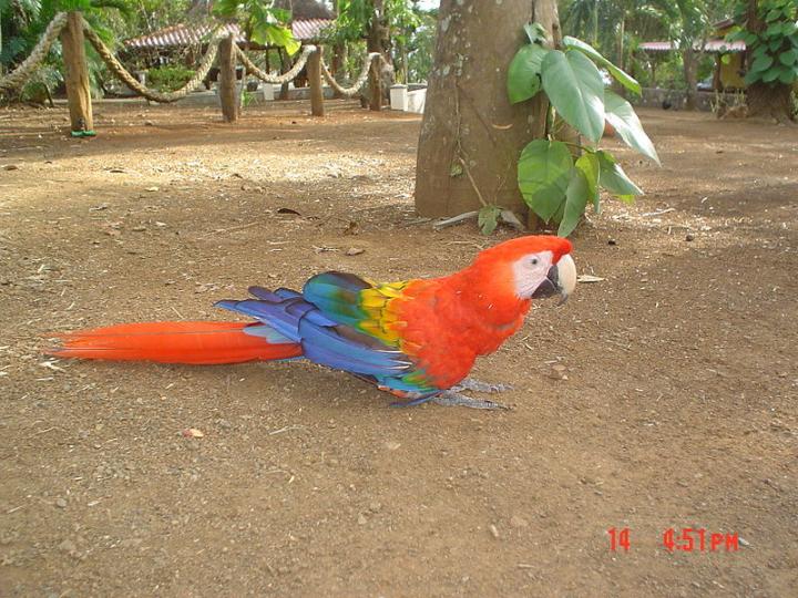 image: Scarlet macaw (A.M. cyanoptera) walks on the ground.