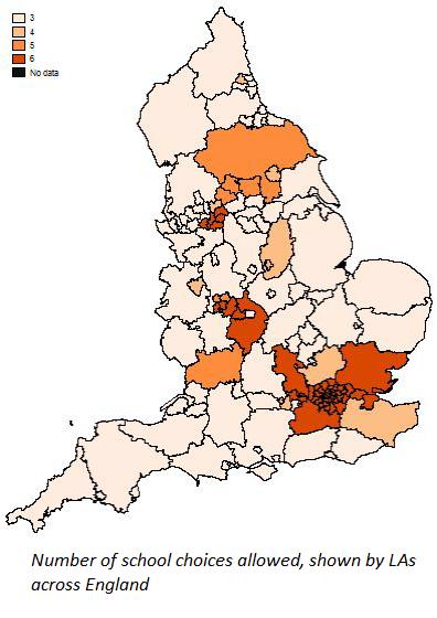 image: Number of school choices allowed, shown by LAs across England.