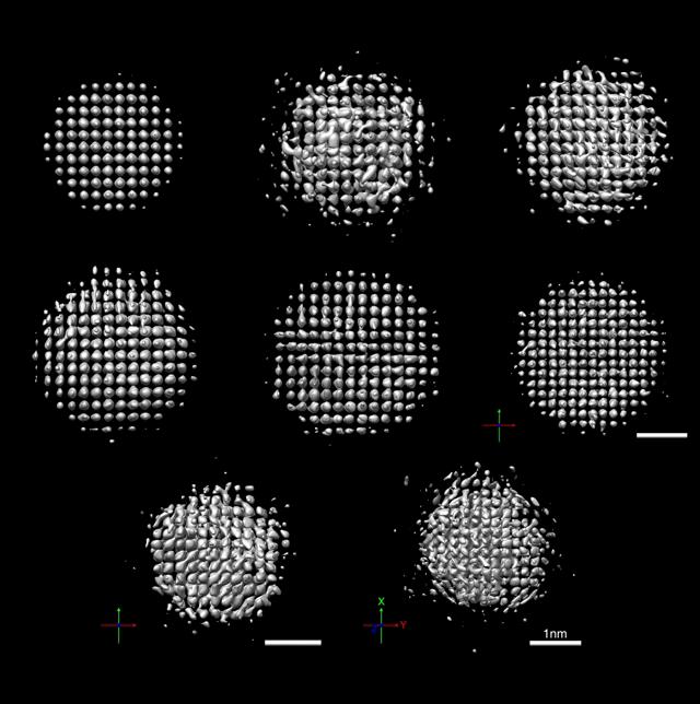 image: 3D images of platinum particles between 2-3 nm in diameter shown rotating in liquid under an electron microscope. Each nanoparticle has approximately 600 atoms. White spheres indicate the position of each atom in a nanoparticle.