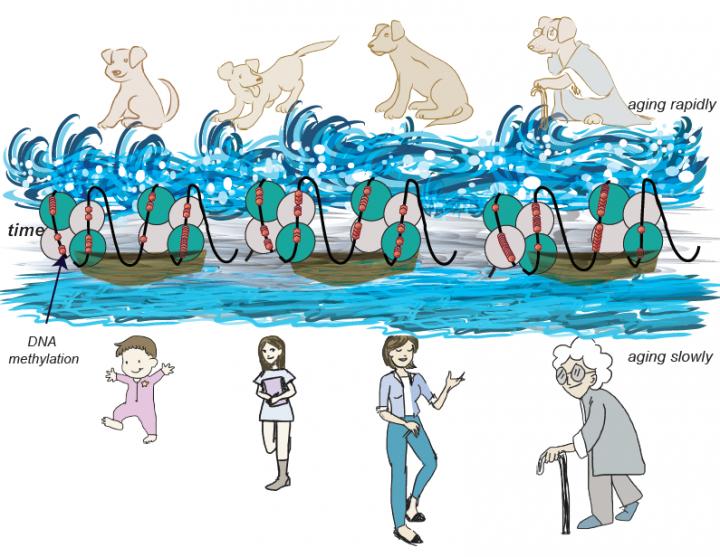 Human and dog DNA, which codes who we are, doesn't change much throughout the course of life, but chemical marks on the DNA, called methylation marks, do. Ideker considers these marks like wrinkles in the genome. "I tend to think of it very much like when you look at someone's face and guess their age based on their wrinkles, gray hair, and other features," he says. "These are just similar kinds of features on the molecular level."