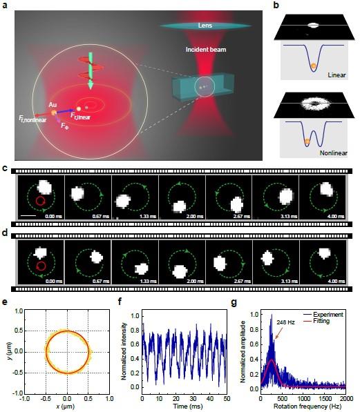 The researchers trapped gold nanoparticles using a circularly polarized NIR femtosecond laser beam with Gaussian mode. In the linear interaction regime, the trapped particles only spin in the beam center. In the nonlinear regime, however, an annular potential well can be formed by the effect of the "trap split," and the tangential optical force enhanced by the nonlinear polarization between the femtosecond laser and gold nanoparticles causes the particles to orbit at an ultra-fast speed in the annular trap well.