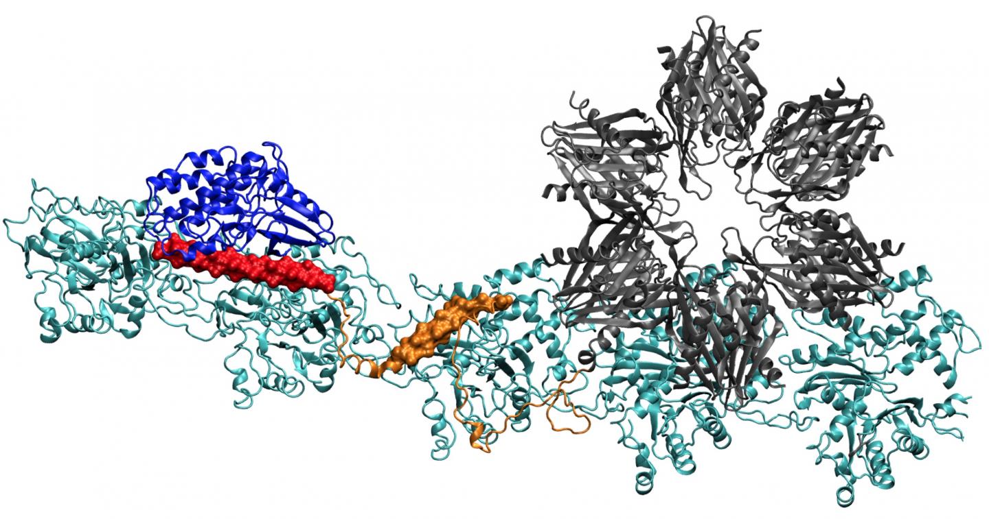 image: A model of the CaMKII protein shows multiple domains that allow it to bind actin filaments in the dendrites of neurons into bundles, giving the dendrites their shape. Researchers at Rice University, the University of Houston and the University of Texas Health Science Center at Houston believe the complex is key in the formation of long-term memory.