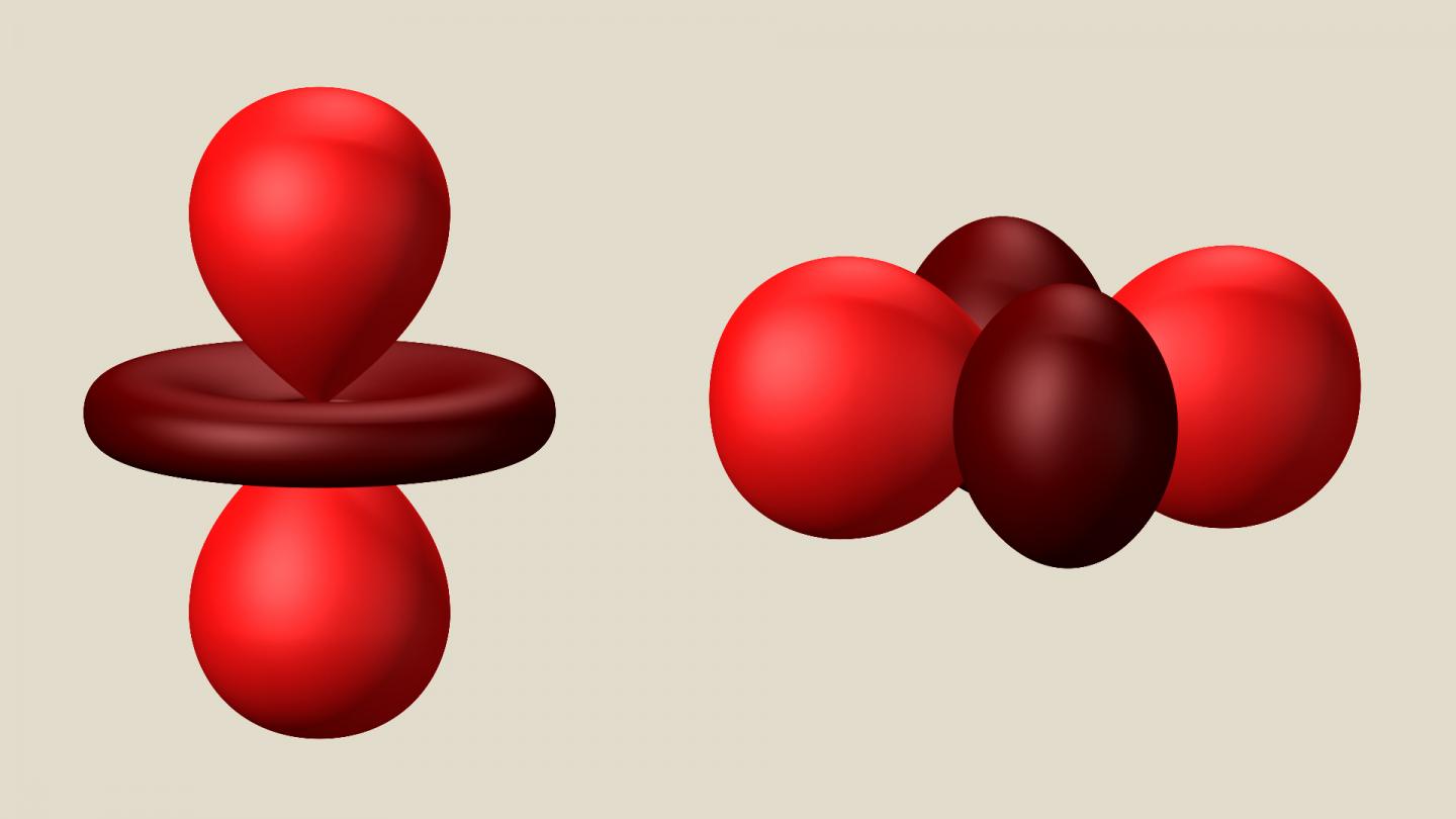 image: These balloon-and-disc shapes represent an electron orbital -- a fuzzy electron cloud around an atom's nucleus -- in two different orientations. Scientists hope to someday use variations in the orientations of orbitals as the 0s and 1s needed to make computations and store information in computer memories, a system known as orbitronics. A SLAC study shows it's possible to separate these orbital orientations from electron spin patterns, a key step for independently controlling them in a class of materials that's the cornerstone of modern information technology.
