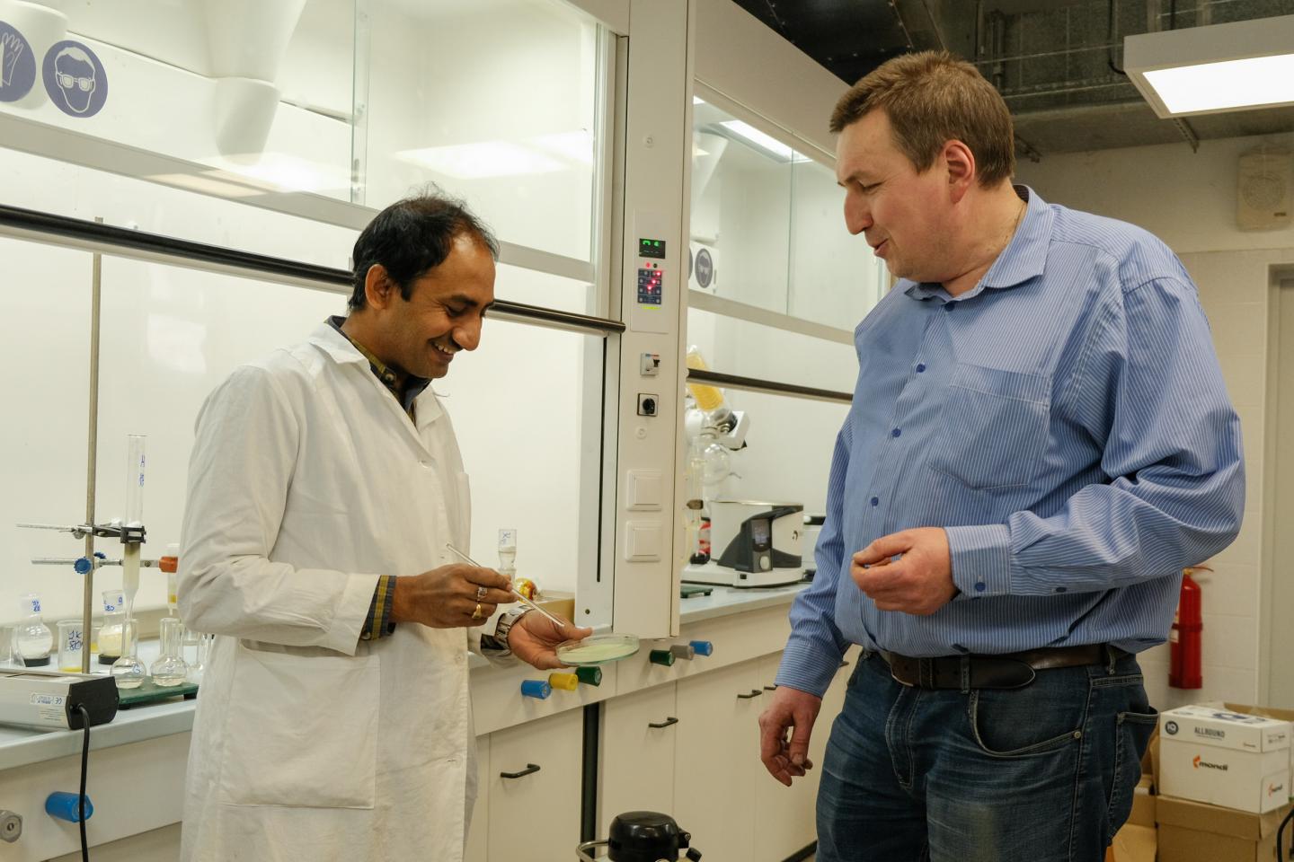image: Rammohan Aluru and Grigoriy Zyryanov ones on scientists group, who have developed edible food films based on seaweed (stripped off solution of ferulic acid and sodium alginate in a Petri dish).