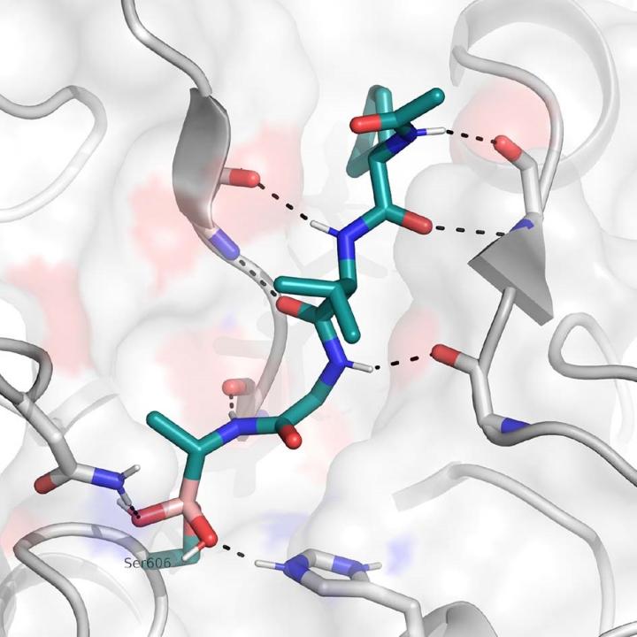 image: The optimized boronic acid inhibitor shown covalently bound into the active site of SUB1. Hydrogen bonds between the inhibitor and the enzyme are shown as dotted lines.
