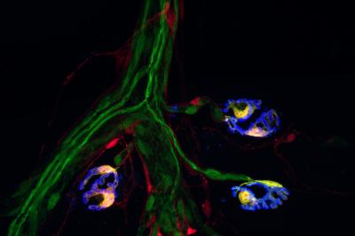 image: Two molecular markers, indicated by the red and green fluorescence, are found together only in synaptic Schwann cells. Together they offer a "bar code" that identifies Schwann cells, an important subtype of glia.