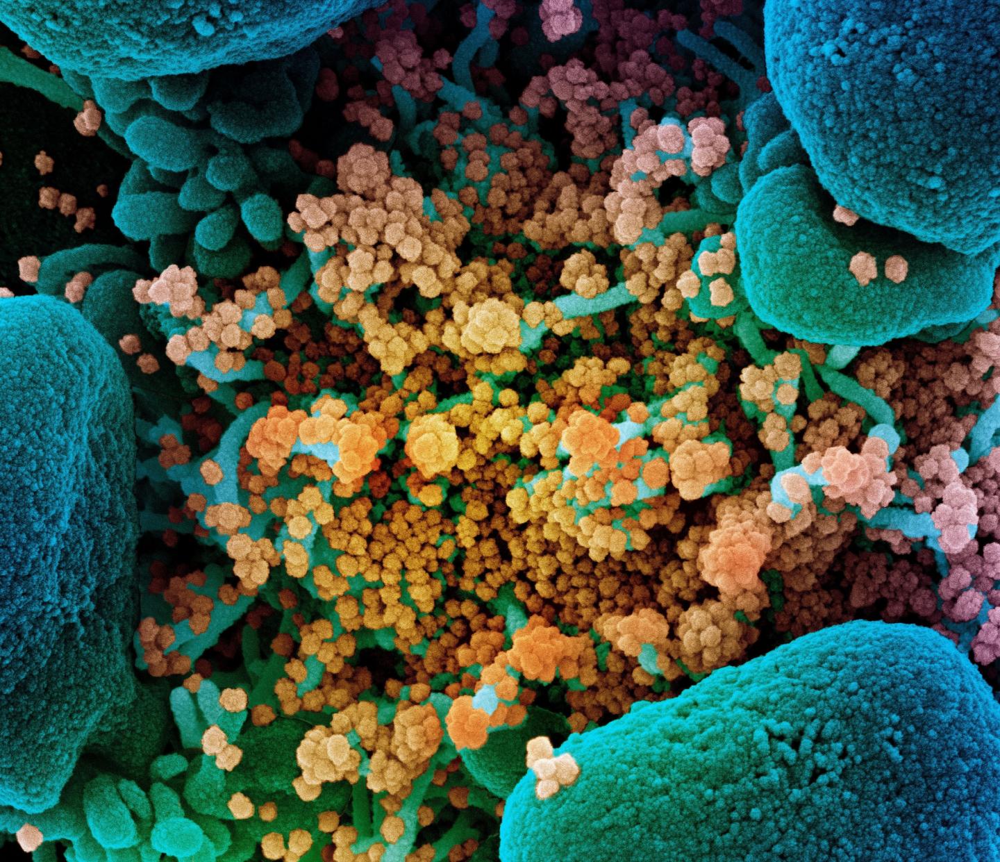 image: Colorized scanning electron micrograph of a dying cell (blue) heavily infected with SARS-CoV-2 (yellow), the virus that causes COVID-19.