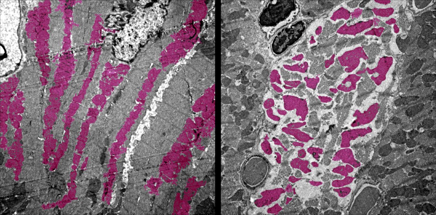 image: Heart muscle cells in an uninfected mouse (left) and a mouse infected with SARS-CoV-2 (right) with mitochondria seen in pink. The disorganization of the cells and mitochondria in the image at right is associated with irregular heartbeat and death.
