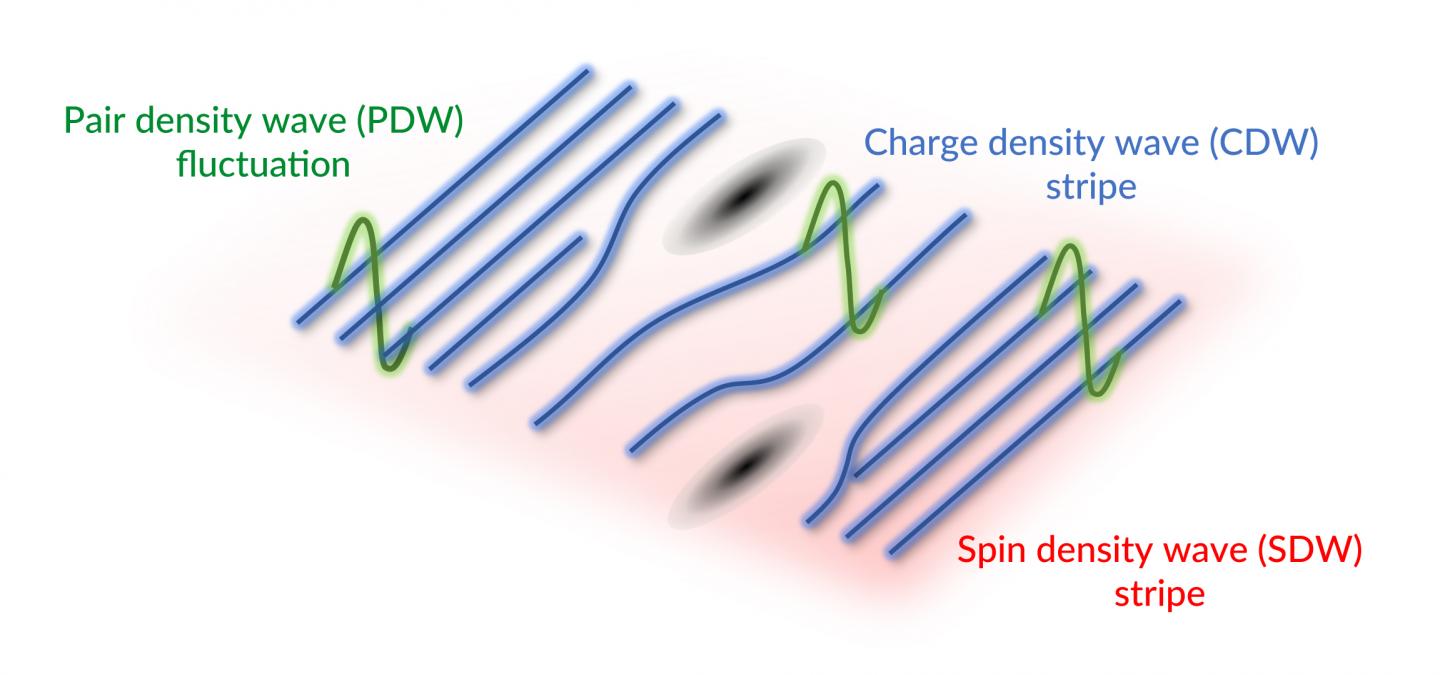 Now scientists at the Department of Energy's SLAC National Accelerator Laboratory have glimpsed the signature of one of those phases, known as pair-density waves or PDW, and confirmed that it's intertwined with another phase known as charge density wave (CDW) stripes - wavelike patterns of higher and lower electron density in the material.
