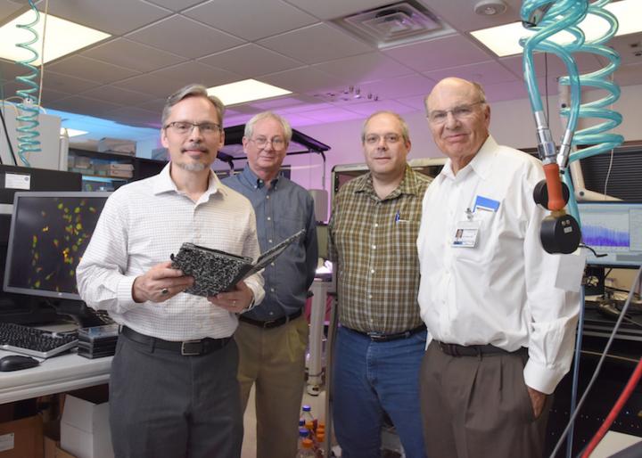image: From left, Dr. Bruce Posner, Dr. Michael Roth, Dr. Michael Peyton, and Dr. John Minna were part of the team scientists who identified 170 chemicals for potential new targets to develop drugs to treat lung cancer.