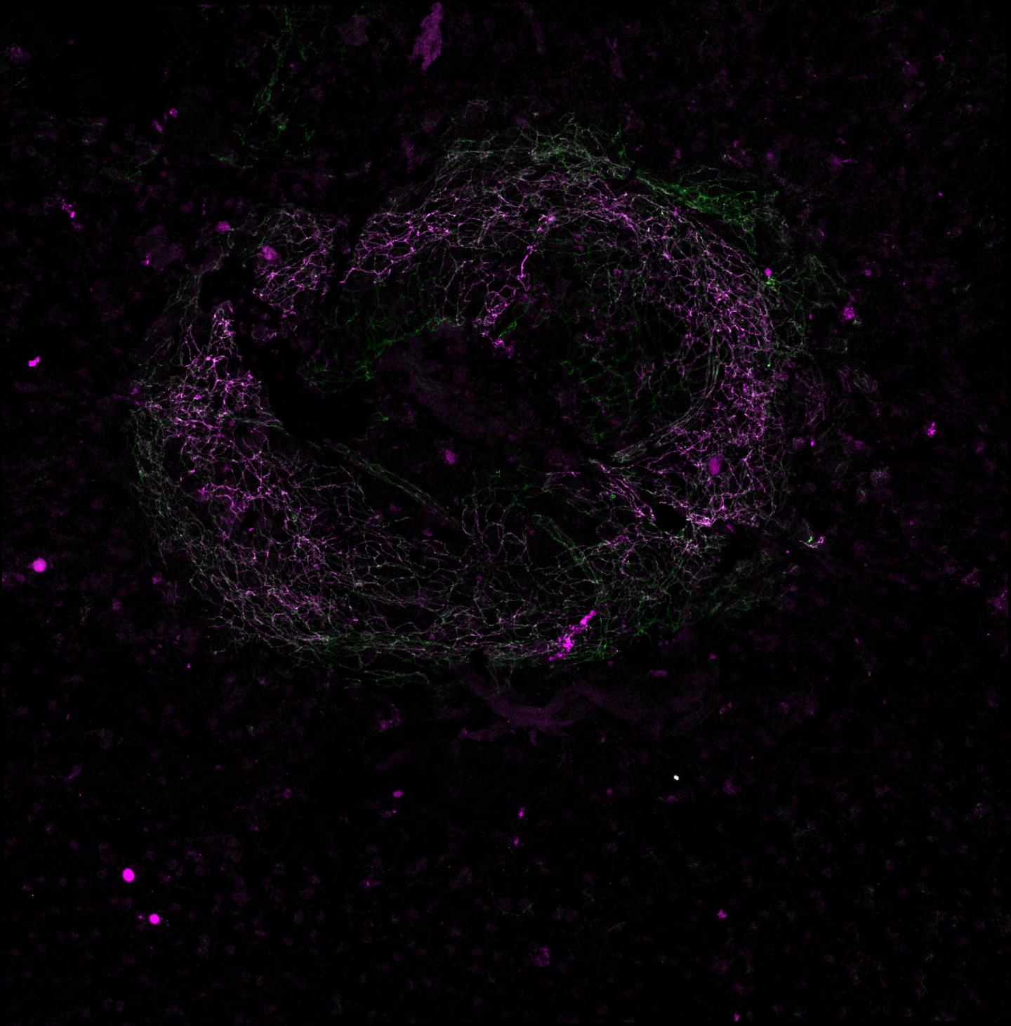 image: Image of a vascular lesion in a mouse model of eye disease, with leaky blood vessels marked by immunofluorescent staining for vascular endothelial-cadherin phosphorylation at the amino acid Y685 in endothelial cell-cell junctions