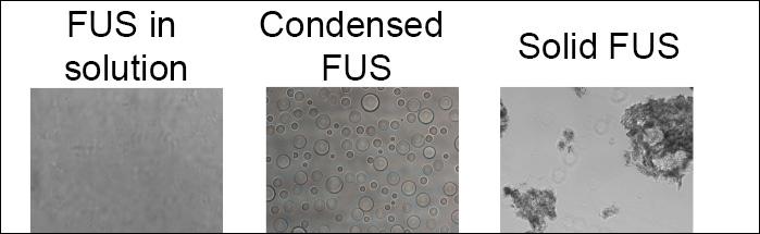 One of these important phase-changing proteins is called FUS. In healthy cells, FUS switches between floating diffusely and condensing into liquid droplets with other proteins to make, edit and deliver the blueprints for protein production. However, FUS also has a "solid" or aggregate phase that has been found in some people with severe cases of amyotrophic lateral sclerosis (ALS) and a type of dementia called frontotemporal dementia.