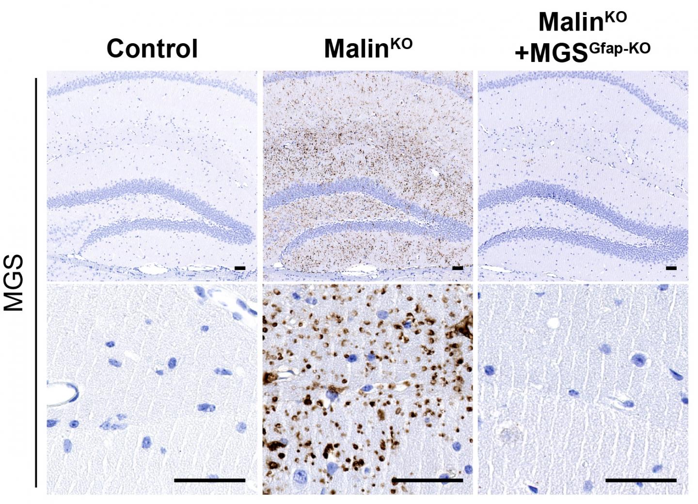 image: Bodies that accumulate in the disease disappear when the ability of astrocytes to produce glycogen is removed.