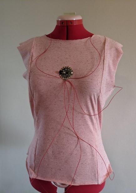 image: A garment sewn with conductive yarn, with seams connected by wire to a microcontroller.