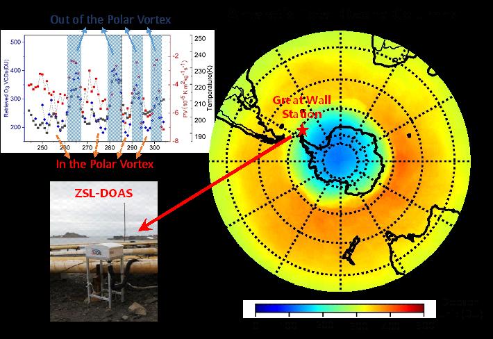 The team used Zenith Scattered Light Differential Optical Absorption Spectroscopy (ZSL-DOAS) techniques to measure ozone depletion near the edge of the polar vortex at the Fildes Peninsula on King George Island (62.22S, 58.96W). ZSL-DOAS can accurately quantify the column density of ozone. The ozone columns were compared with the stratospheric ozone profiles from NASA's MERRA2 ozone database and PV profiles from the ECMWF dataset, which helped better understand the causes of ozone depletion.