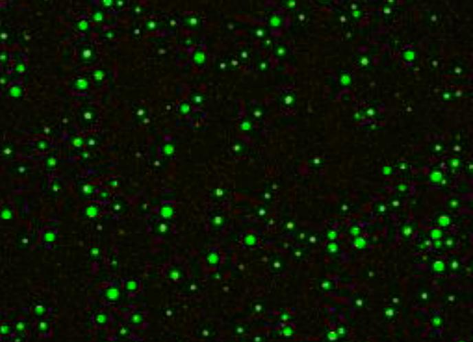 image: Like stars in the night, liquid droplets of RNA (the bright green spheres) float in a solution containing high concentrations of divalent magnesium cations. The droplets are imaged through confocal fluorescence microscopy.