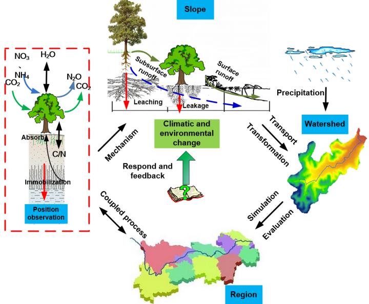 The regional C-N-H2O coupling cycle is a strong coupling process that occurs between physicochemical process and biogeochemical processes in terrestrial and aquatic ecosystems through hydrological flux, and it is closely related and intercoupled biogeochemical processes.