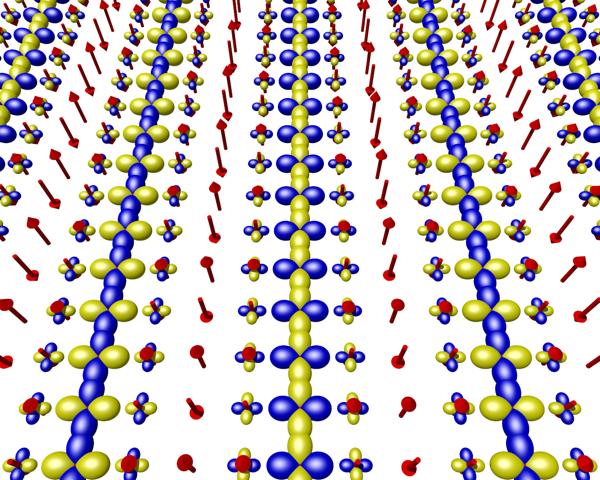 image: This schematic diagram maps out the binding energy (or superconducting energy gap) of individual electrons in a copper-oxide (cuprate) superconductor as measured by a sensitive microscope scanning across the surface. The size of the blue and yellow blobs surrounding individual atoms (red rods with arrowheads indicating their spin orientations) indicates the size of the energy gap (the larger the blobs the bigger the gap and stronger the electron-pair binding at that location). Note how when scanning across horizontal rows, the pattern increases to a maximum, then decreases to a minimum (no blobs), increases to another maximum with the opposite orientation (yellow and blue blobs switched) and then a minimum again, repeating this pattern every eight rows. These modulations are the first direct evidence of a "pair density wave," a state of matter that coexists with superconductivity and may play a role in its emergence.