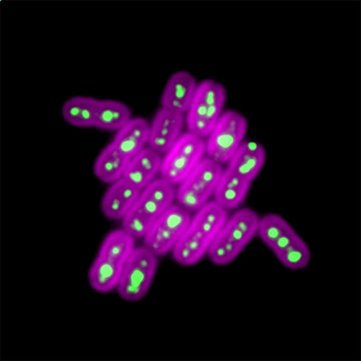 So, Cameron and his colleagues tracked specific enzymes within these cells' carboxysomes, by tagging them with a green fluorescent marker. They then added chemicals to curb the ability of the cell to make new carboxysomes. Researchers tracked them for several days using live cell imaging as they were passed from mother to daughter cells.