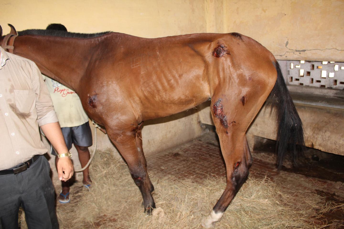 image: Inspections of facilities where horses are used to produce animal-derived antitoxins have found widespread neglect of animal welfare regulations, with horses confined to filthy, severely crowded enclosures and suffering from anaemia, diseased hooves, eye abnormalities, infections, parasites, and malnutrition. This horse has untreatable acute laminitis, is very thin, and has numerous pressure ulcers from being unable to stand for very long.