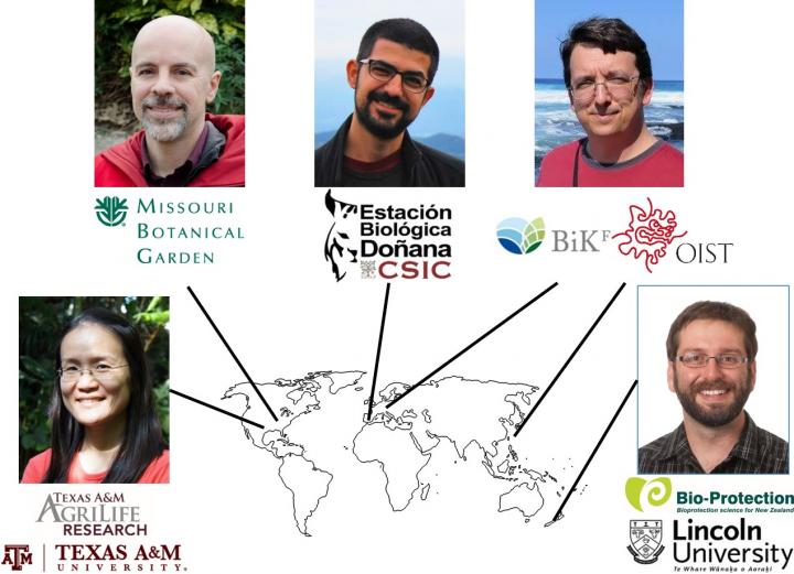 image: TOP LEFT TO RIGHT: Dr. Adam Smith, Missouri Botanical Garden; Dr. Francisco Rodríguez-Sánchez, Estación Biológica de Doñana; Dr. Dan Warren, Senckenberg Biodiversity and Climate Research Center and Okinawa Institute of Science and Technology. BOTTOM LEFT TO RIGHT: Dr. Hsiao-Hsuan "Rose" Wang, Texas A&M University; Dr. William Godsoe, Lincoln University.