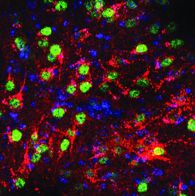 image: Researchers turned the ventral midline thalamus on and off in mice to study the animals' responses to visual threats. Activated brain cells are shown in green.